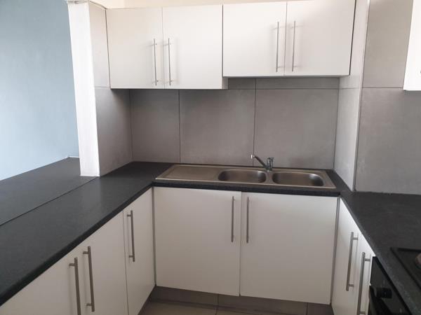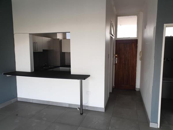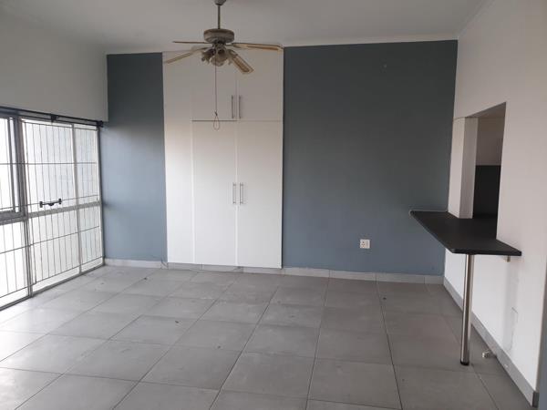 Refreshing, modern studio apartment with parking. A tiled studio apartment in pristine condition. This unit has a complete kitchen, built in cupboards for the room and lounge area which is of a generous size, and a bathroom consisting of a bath with a shower head and glass fitting, basin and toilet.