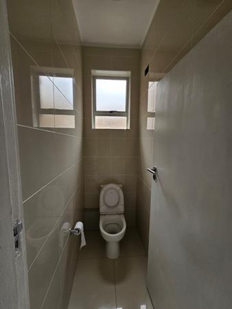 Bathroom has a modern shower with toilet and basin. Good fittings