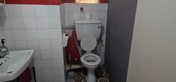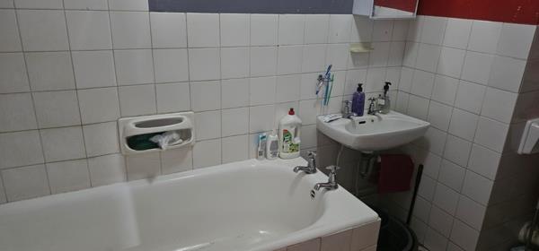 Medium size fitted kitchen and common bathroom with tub, toilet and basin.