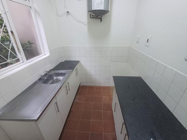 - Bright kitchen with space for fridge and stove.