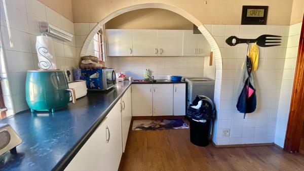 A cozy enclosed dining room leads into a practical kitchen with ample storage space and plumbed for a washing machine.