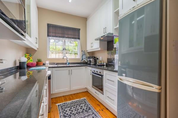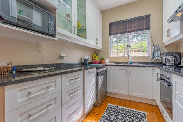 The modern kitchen is fitted with granite countertops, ample built-in cupboards, a built-in stove, hob, extractor, and is plumbed for a dishwasher. Theres also a separate guest loo, while the fully tiled bathroom includes a shower, basin, and toilet.