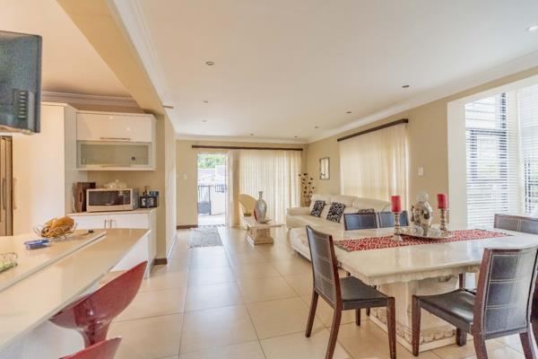 The heart of the home is an expansive open-plan living space that seamlessly connects the lounge, dining area and gourmet kitchen. Large windows in the lounge flood the room with natural light while framing picturesque views of the landscaped garden. The dining area flows effortlessly into the kitchen, which is a chefs dream, complete with state-of-the-art appliances, granite countertops, a central island with a breakfast bar and bespoke cabinetry. Sliding glass doors lead from the living space to a manicured lawn and beautifully landscaped outdoor area, perfect for entertaining or relaxing.