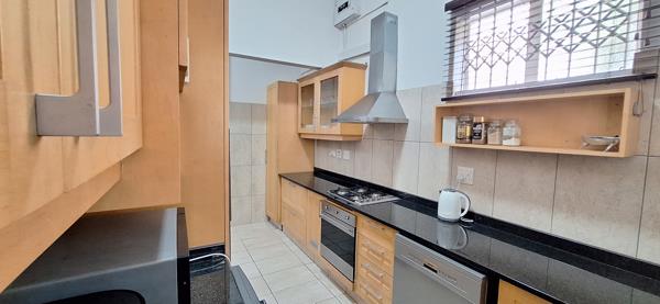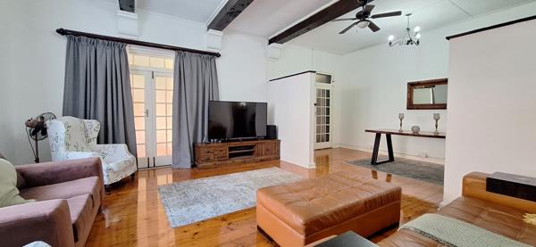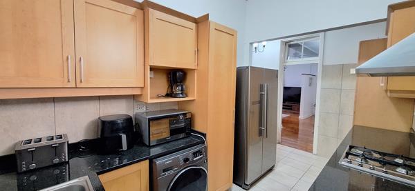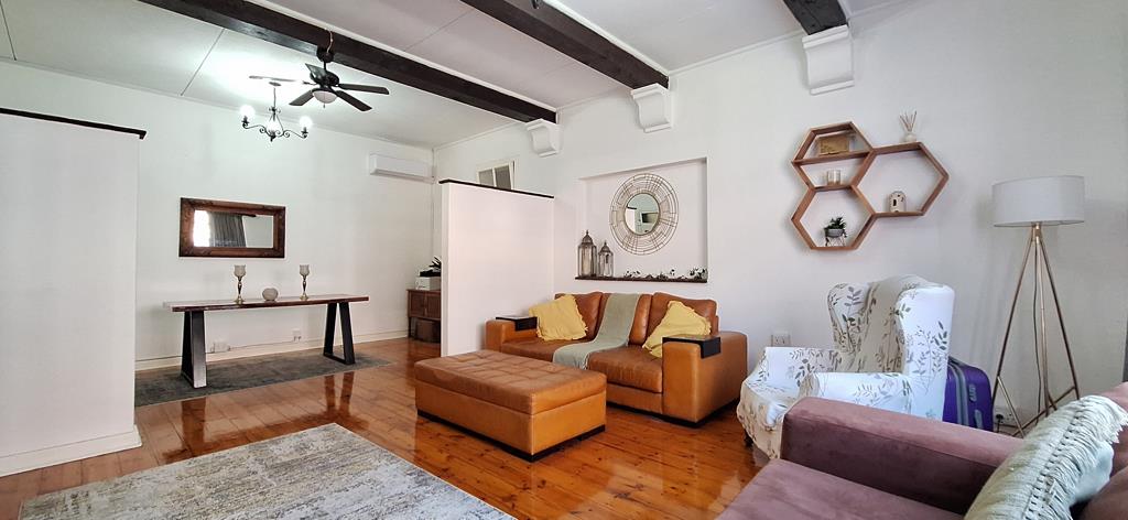 Step inside to be greeted by striking sleeper beam ceilings and warm wooden floors that flow through the expansive open-plan living and dining area. The modern kitchen stands out with sleek granite counter-tops, ample cupboard space, and room for a double-door fridge, ideal for both everyday living and effortless entertaining.