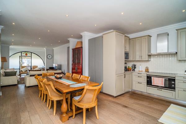 Gourmet kitchen, featuring marble stone countertops, an oven, hob, extractor fan, and integrated fridge/freezer andamp dishwasher. Expansive dining area with a built-in server, marble stone countertops, and soft-touch drawers.