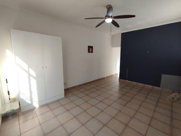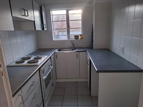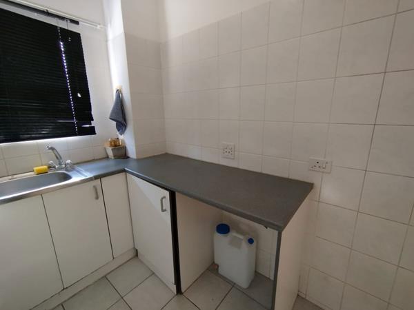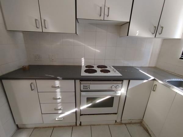 Lounge/Bedroom and kitchen with built-in cupboards. Under counter oven and hob.