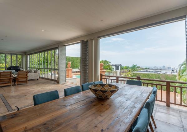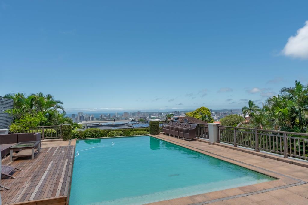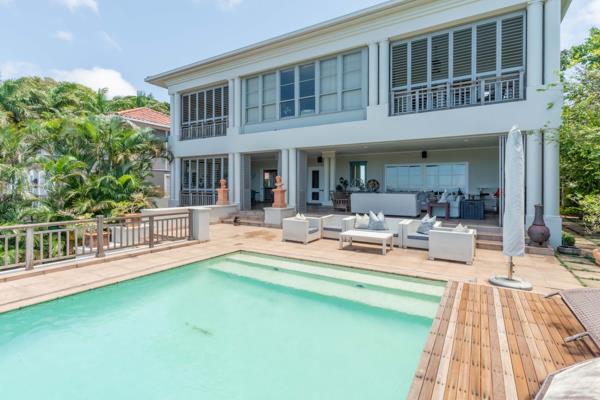 Flowing effortlessly from the lounge, the dining area leads to the bespoke, expansive kitchen. This culinary masterpiece boasts a central island, breakfast nook, premium appliances, and a separate laundry and scullery. Perfectly designed for entertaining, the living spaces open through seamless stack-back doors to a grand entertainment area. Here, a sparkling pool shimmers against the backdrop of elevated sea and city views, creating a haven for lavish gatherings and tranquil evenings alike.