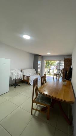 The open-plan living area is finished with porcelain tiles and flows into a contemporary kitchen fitted with built-in cupboards and Caesarstone countertops. The kitchen is also plumbed for a washing machine. Large french doors lead from the lounge to a private garden and covered patio, creating a seamless indoor-outdoor lifestyle.