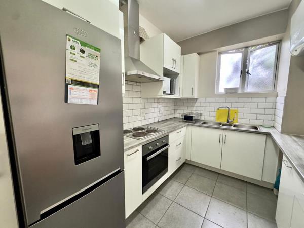 The kitchen is modern featuring subway tiles, double stainless steel sink, oven & hob with extractor.