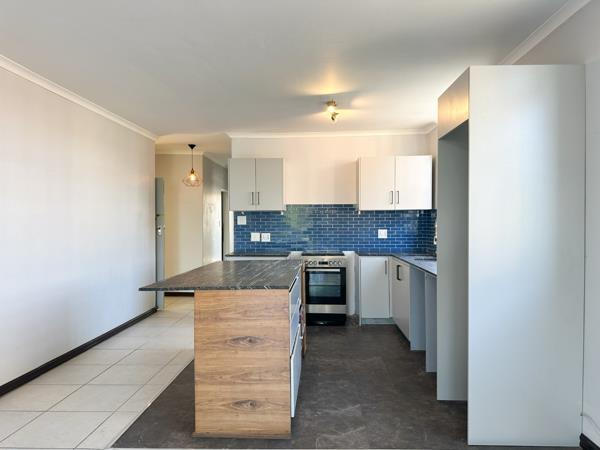 There are two well-sized bedrooms, each with built-in cupboards. The main bedroom offers ample cupboard space and includes an en-suite bathroom. The second bathroom is fitted with a shower, basin, and toilet. The apartment is fully tiled throughout, offering a clean and modern finish.