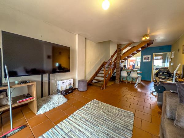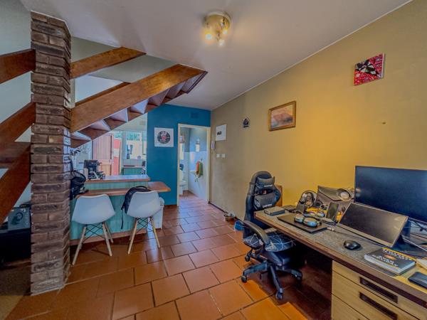 Discover this charming 74 sqm residential property in Essenwood. This inviting home features an open-plan living area, characterized by durable terracotta-style tiled flooring and unique architectural elements, including a natural wood staircase and a distinctive brick pillar. The layout seamlessly integrates a functional desk area, perfect for a home office, and flows into a practical kitchen equipped with essential appliances and offering direct access to the outdoors. The property provides 2 comfortable bedrooms and 1.5 well-appointed bathrooms, ensuring ample space for residents.