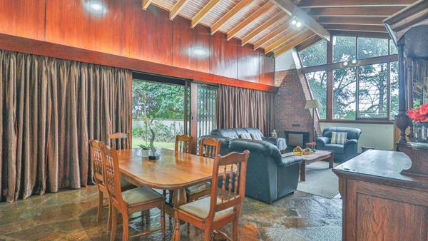 At the heart of the home lies a magnificent, ultra-large living and dining area, crowned by a soaring wood-panelled ceiling and illuminated by a striking feature window. Sliding doors open to a deep, covered patio, offering seamless indoor-outdoor flow to a private, level garden—a serene haven filled with mature indigenous trees.