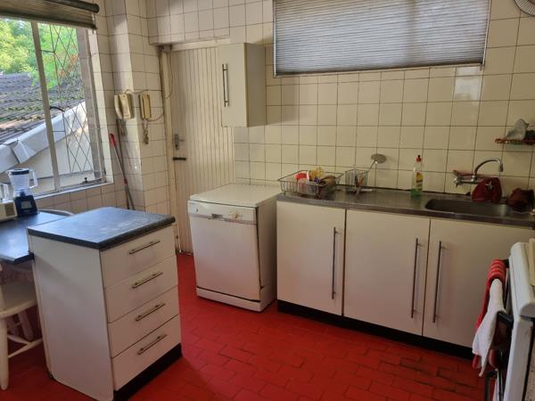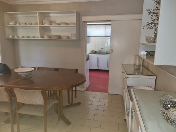 Step through the tall double doors and into a bright open-plan dining area, leading into a well-appointed kitchen with sink and generous cupboard space. Adjacent to the kitchen is a spacious lounge/entertainment area, complete with a guest toilet, built-in braai area, and sliding doors opening onto a patio perfect for entertaining.