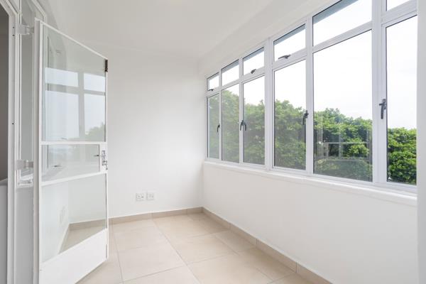 The sleek and stylish kitchen is fitted with an oven, hob and plumbed for washing machine. Off the bedroom and the lounge is an enclosed balcony large enough to be a childs bedroom or a work-from-home office. The bedroom is fitted with ample modern built-in cupboards.