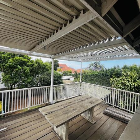 The outdoor area is designed for relaxation and entertainment, including an expansive deck with an awning, a swimming pool surrounded by concrete seating, and secure parking with two garages and additional parking spaces. A separate flatlet equipped with a kitchen, lounge, and full bathroom offers ideal accommodation for extended family, guests, or potential rental income. The property is fully fenced and includes an electric gate, electric fencing, and an internal white picket fence that neatly divides the two main sections.