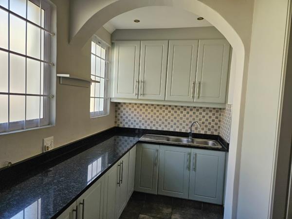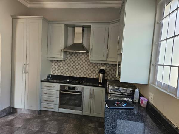 The well-appointed kitchen has ample cupboard space, granite counter tops, gas hob, electric oven and extractor fan.