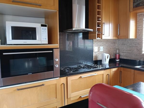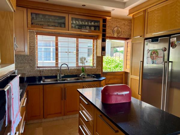 One enters the home through elegant double front doors, into the first of two large lounges. The second lounge is located further down the passage and is also large, light and bright. There is aseparate diningroom, open to the kitchen which has a granite island with bar stools. The kitchen is fitted with a 5 plate gas stove, an under-counter oven, extra hood and granite tops. There is space for side by side standing fridge and freezer.
