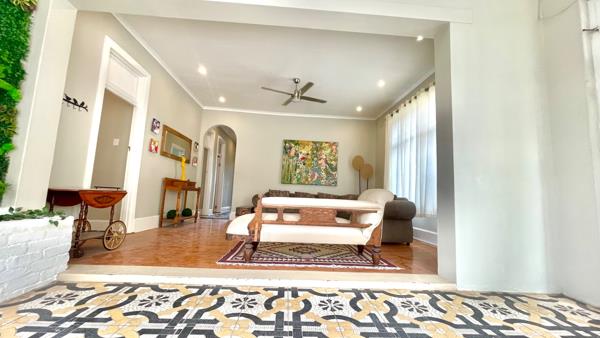 The formal entrance hall, distinguished by its authentic Spanish tile flooring and a grand bay window, establishes an immediate impression of sophisticated charm. This space seamlessly transitions into a spacious lounge area, ideal for both relaxation and formal entertaining. The kitchen is a testament to modern design, equipped with state-of-the-art gas appliances, durable Caesarstone countertops, and a separate scullery, pre-plumbed for both a dishwasher and a washing machine, ensuring optimal functionality.