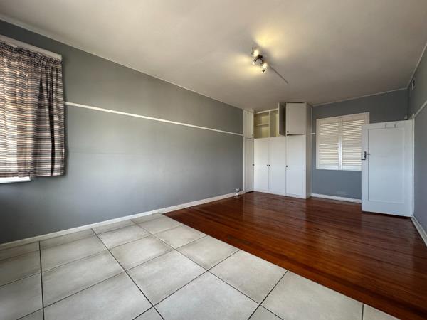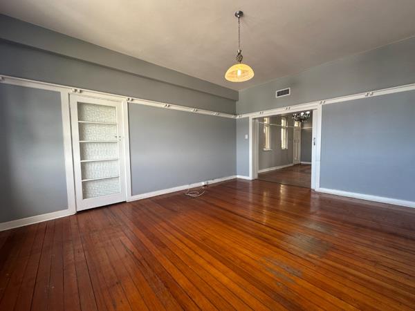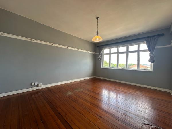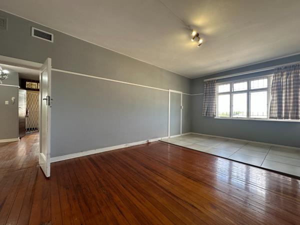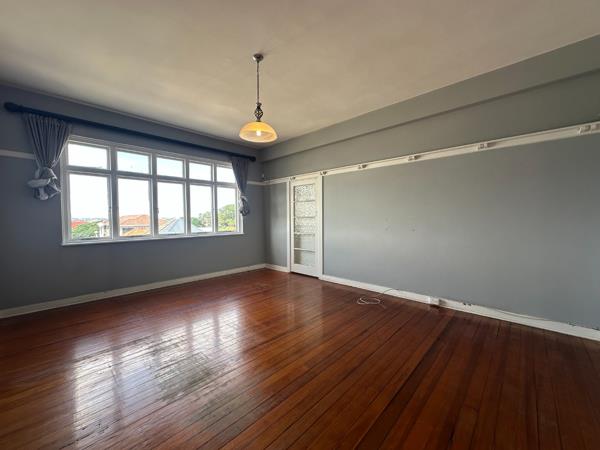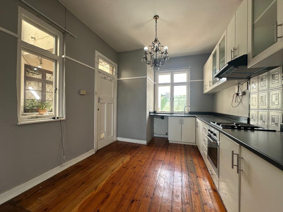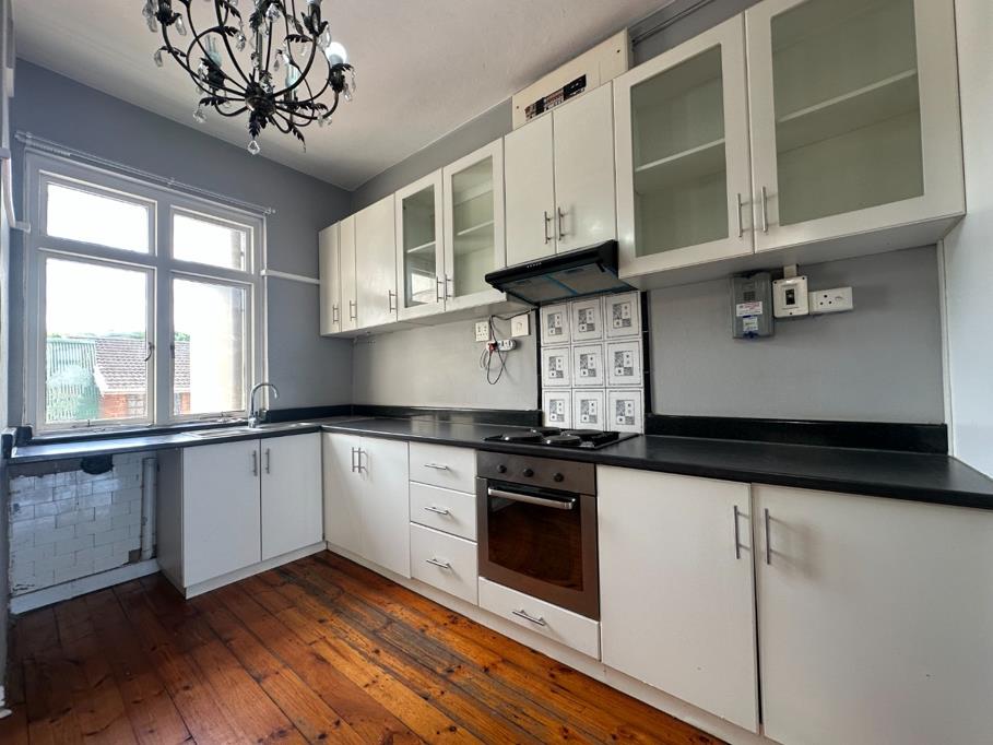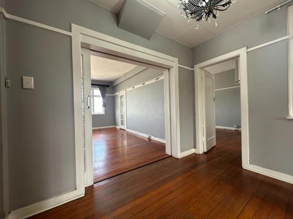 Discover this charming 110 sqm residence in Durban, offering a blend of character and comfort. The inviting interior features a well-appointed kitchen, boasting ample white cabinetry, dark countertops, and integrated built-in oven and hob. Natural light streams through large windows, illuminating the space, which is further enhanced by characterful hardwood floors and a decorative chandelier. Adjacent to the kitchen, the spacious lounge offers a comfortable living area, continuing the polished hardwood flooring and neutral grey walls, complemented by high ceilings and architectural details like picture rail molding and open archways, creating a seamless flow.