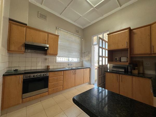 The second and third bedrooms have shared access to a well-appointed communal bathroom featuring both a bathtub and shower, with a separate toilet for added convenience. The open-plan lounge and dining room provide ample space for entertaining family and guests, conveniently located adjacent to the kitchen. The kitchen itself is large and functional, boasting granite countertops, an extractor fan, and a separate scullery area ideal for housing additional appliances.