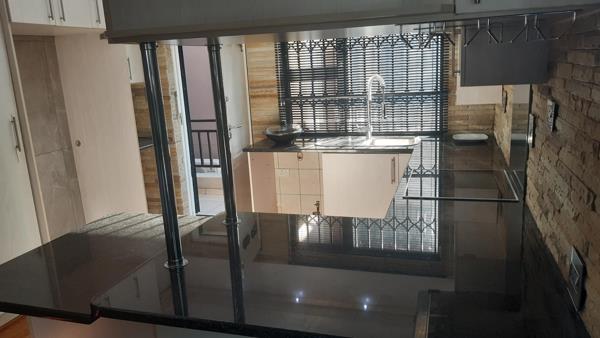 This two bedroom unit is modern with high-end finishes. The kitchen has granite top open plan to lounge and diningroom. The lounge area has bamboo wooden flooring with A/C and blinds which leads to a balcony. Both bedrooms are neat with blinds and build in cupboards.