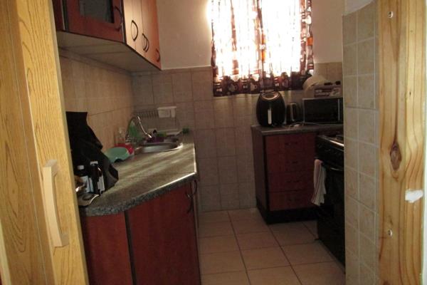 The kitchen is fully fitted with ample cupboards. Grey wooden tops and a double sink. Space for fridge and stove. The kitchen floor is tiled whilst the rest of the unit has laminated flooring.