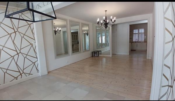 Fully renovated open-plan lounge and dining area with restored wooden floors, modern chandelier, and large mirrors