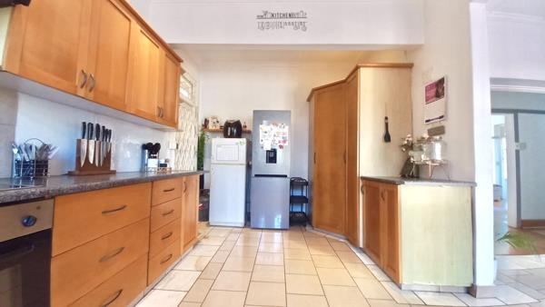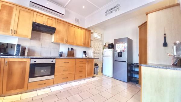 Upon entry, one is greeted by a lovely open-plan kitchen, boasting modern fittings and finishes. It features elegant built-in cupboards, a double sink, a modern stove with an undercover oven and an extractor fan, as well as dedicated plumbing for a dishwasher and washing machine. The kitchen is also equipped with an air conditioner and ample space to accommodate both a single and a double fridge.