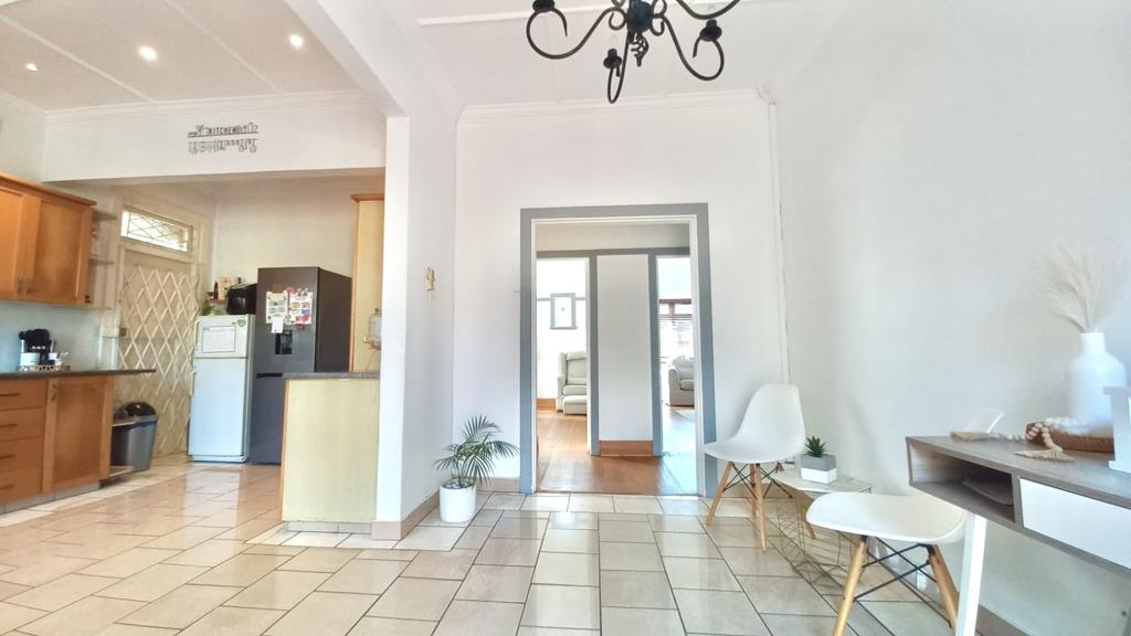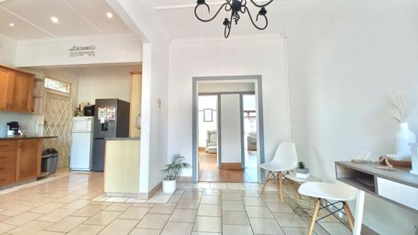 The kitchen flows effortlessly into the immaculate lounge and dining area, both enhanced by striking, well-maintained wooden flooring throughout and special accent lighting. The areas are fitted with blinds and provide easy access to a versatile half-bedroom or office space, which is fully tiled.