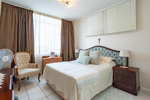 The main bedroom includes built-in cupboards, air conditioning, and a well-designed en-suite bathroom equipped with features to assist the elderly. The second bedroom also has built-in cupboards and a ceiling fan, and is serviced by a neat bathroom with shower and basin.