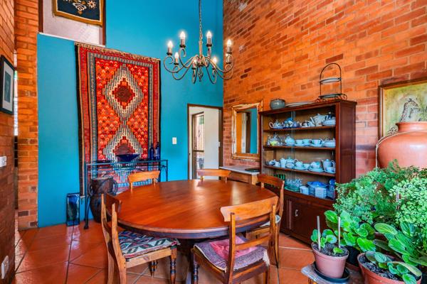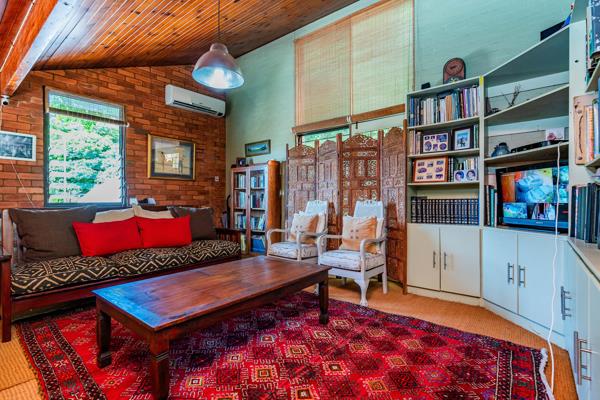 The next level has an even larger formal living room and a dining room, both open onto a wide tiled partially covered entertainment terrace overlooking the pool and garden. The well-appointed kitchen with pantry cupboards, oven, electric hob, extractor hood, dishwasher, washing machine and tumble drier is also found on this level.