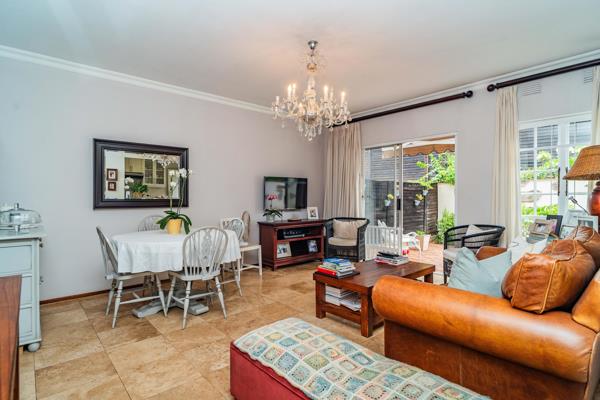 An inviting open-plan living and dining area with elegant travertine tiles, flowing seamlessly through French doors to your private entertainment patio, plunge pool, and lush garden perfect for relaxing or entertaining.