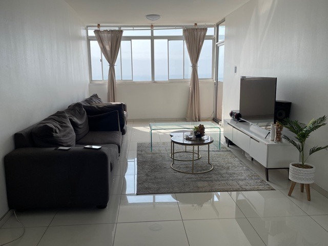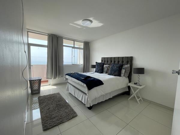 The apartment offers two inviting bedrooms with built-in cupboards, each with direct access to a private balcony that showcases breathtaking sea and city views, including the iconic Moses Mabhida Stadium. The full bathroom includes both a shower and a bathtub, with a separate toilet for added convenience.