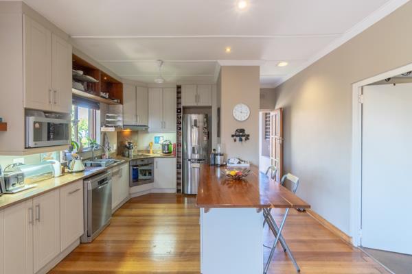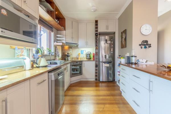 Beautiful open plan kitchen with marble along the wall and the table above the cupboards is wood. This leads into the living area and dining room.