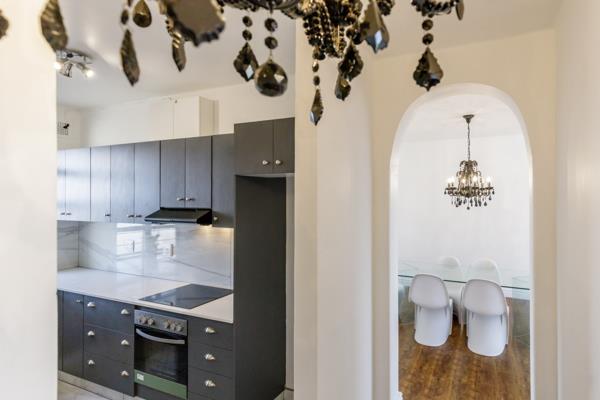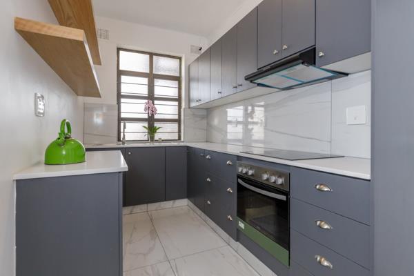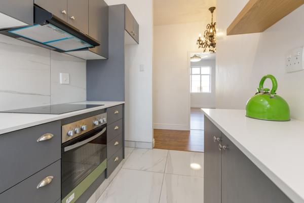 Beautifully renovated 2 bedroom apartment, space and light. High ceiling, art deco ceiling fans and chandeliers. Wooden laminate, antique finish flooring, porcelain white marbled tiled bathroom and kitchen, smokey grey kitchen cabinetry with white quartz counter tops, oak finish open shelving, undercounter oven and glass top hob with extractor fan. Bedrooms, charcoal grey finish wall to floor cupboards, large windows with American Shutters. Bathroom, shower, vanity and toilet, procelain tiles, and plumbed for washing machine.