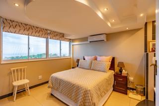 The open-plan lounge and dining area welcomes you with designer bulkhead ceilings, soft downlighting, a built-in bar, and premium-grade porcelain tiling throughout. The living space flows effortlessly onto a covered veranda showcasing sweeping sea and city views perfect for relaxing or entertaining. A custom water feature and air conditioning complete the ambiance.