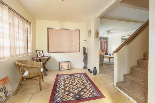 This double story home greets you with a reception area which leads into the lounge area. The spacious lounge is tiled and opens out onto the patio, and entertainment area and swimming pool. The dinning room has oregan flooring and a fire place feature, with its large windows letting in loads of natural light. The kitchen is plumbed for a washing machine or dish washer, and fitted with a hob, oven and extractor, with plenty of built in cupboards.