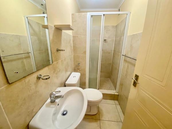 The bedroom is spacious with built-in cupboards. The bathroom consists of a basin, toilet and a shower.