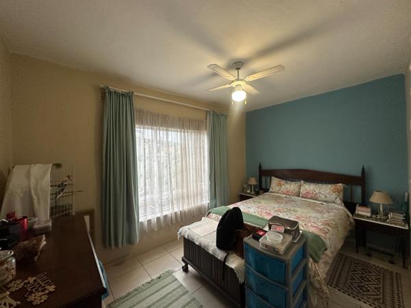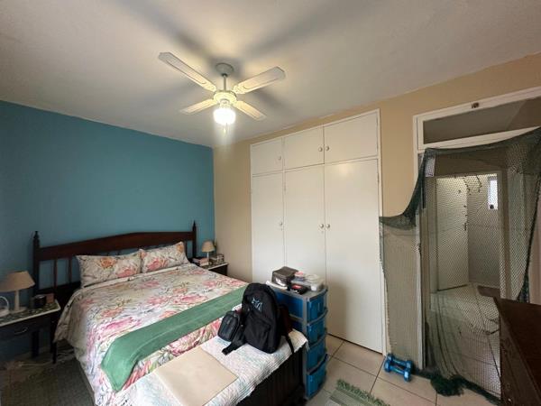 The main bedroom is spacious and has built in cupboards with a ceiling fan.