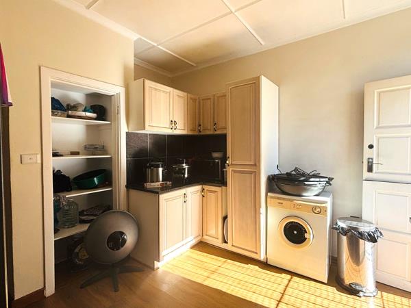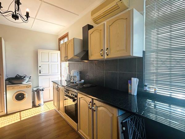 The cozy lounge is carpeted and air-conditioned, creating a perfect space to relax. The kitchen features built-in cupboards, stylish wooden flooring, and its own air conditioning unit for extra comfort while cooking.