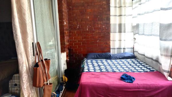 The spacious bedroom opens to an enclosed balcony, which could be used as a second bedroom.