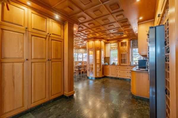 The heart of the home is the chef-style kitchen a true masterpiece. It boasts ample cupboard space, feature glass-front wine cabinets, a centre island with sink and built-in stove, built-in oven and microwave, granite countertops, tiled floors, a wine cellar, and a cold room for added convenience.