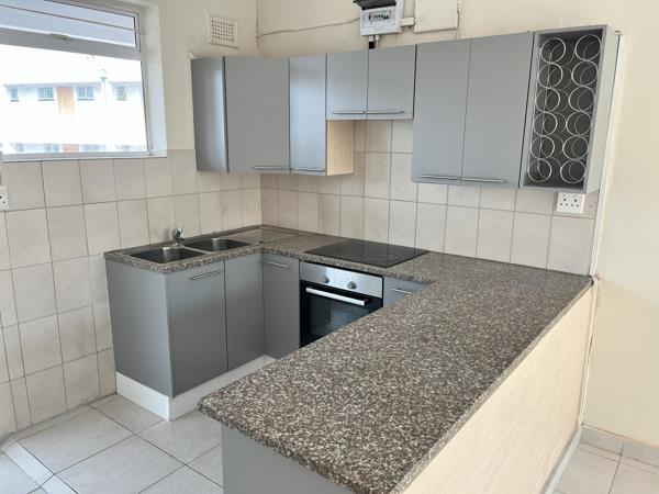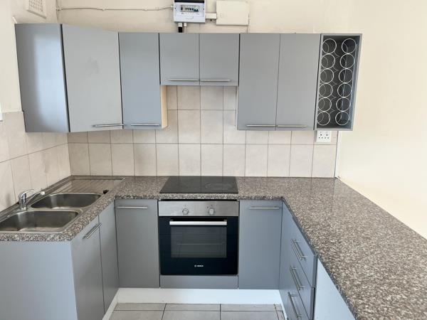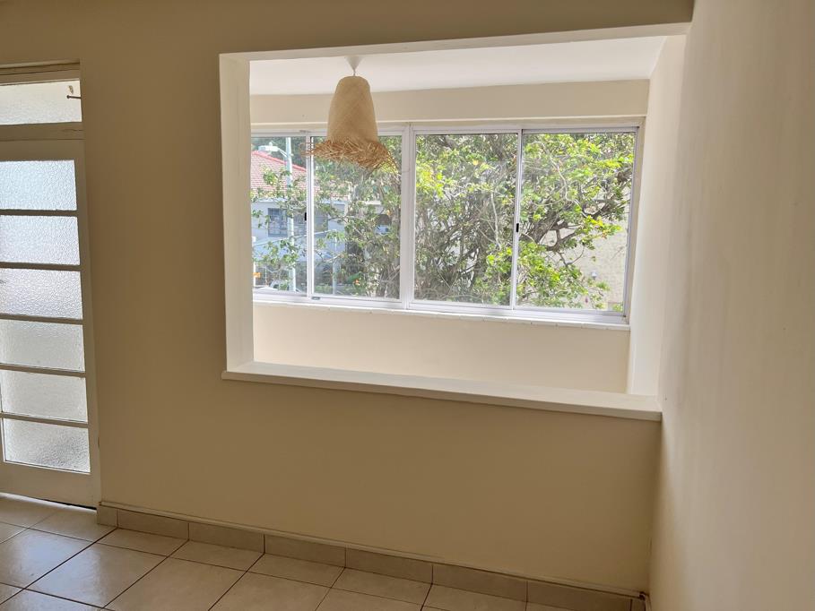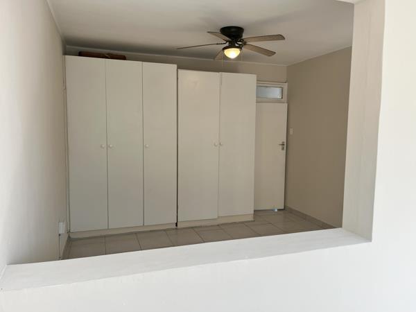 The unit is tiled throughout and features a convenient open-plan kitchen that flows seamlessly into a spacious lounge area. The main bedroom is generously proportioned with built-in cupboards, while the half bedroom makes an ideal study, nursery, or guest room.
