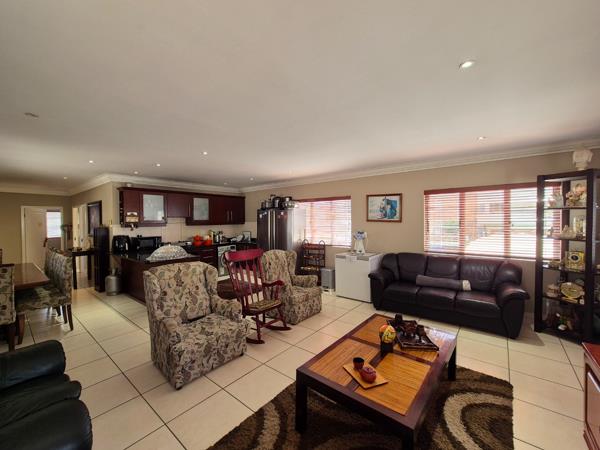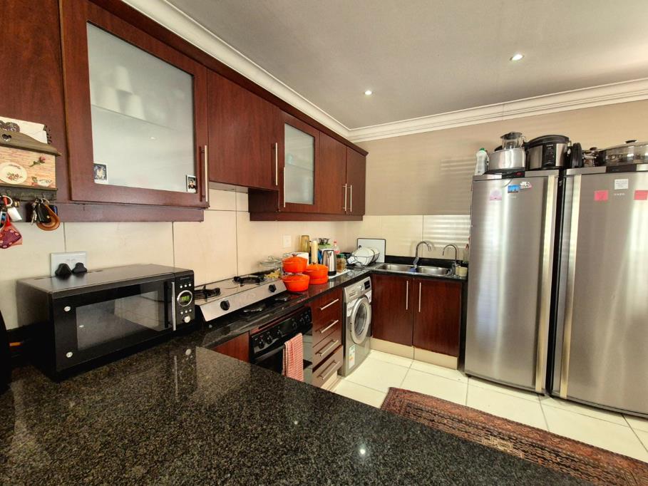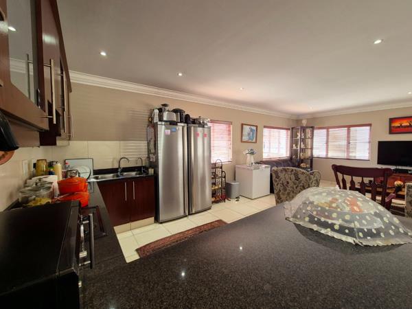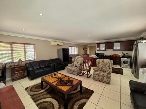 Open plan lounge and dining room area with a fully fitted kitchen with granite tops and plumbing for a washing machine. Two bedrooms with built in cupboards. Main bedroom en suite and separate bathroom. Aluminium windows and tiling throughout. Easy access to the communal laundry lines. Three split level air-conditioners throughout the unit.