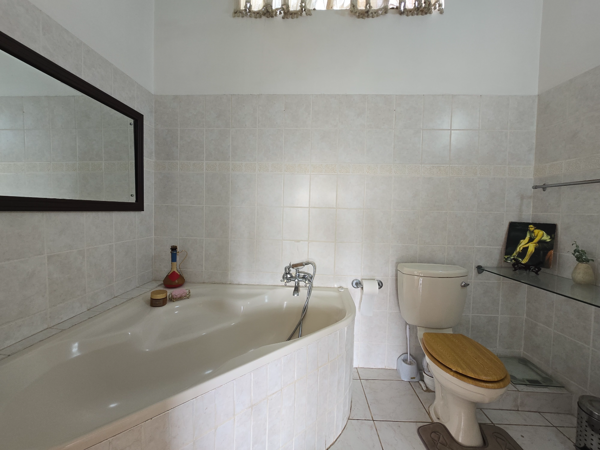 To the left, the main bedroom offers two en-suite bathroomsone with a bathtub, toilet, and basin, and the other with a shower, toilet, and basin. It also includes a walk-in wardrobe, additional built-in cupboards, and air conditioning.
