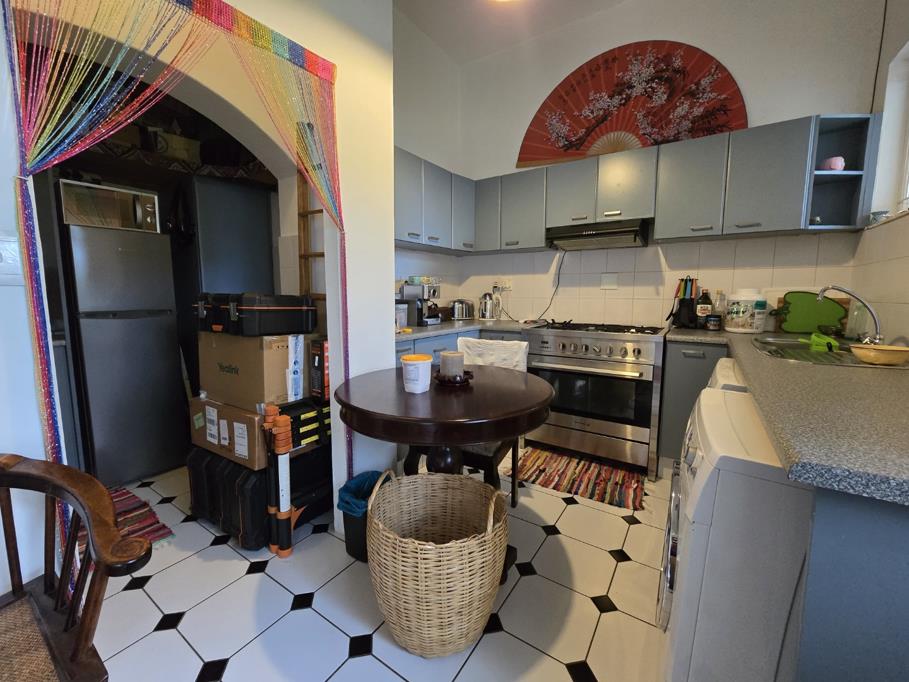 A standout feature of the apartment is its impressive high ceilings, which enhance the sense of space and natural light throughout. The warm wooden flooring in the main living areas adds character and a cozy ambiance, while the kitchen and compact living or study area are finished with sleek tiles, blending practicality with style.