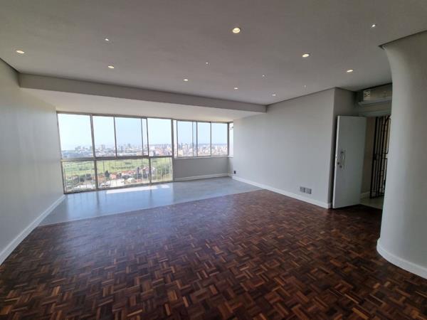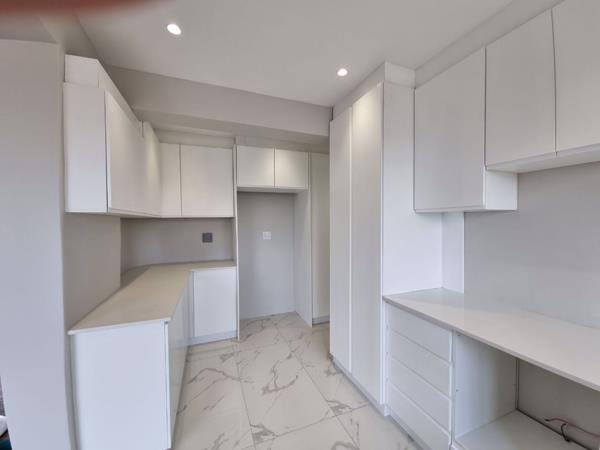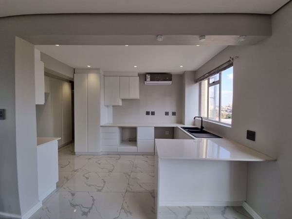 A spacious open plan lounge and dining area overlooks panoramic views of Durban. The kitchen has ample cupboard and counter space with a breakfast nook and pantry cupboard.