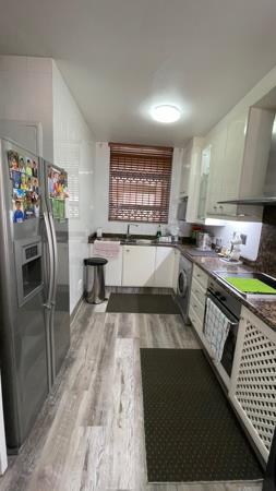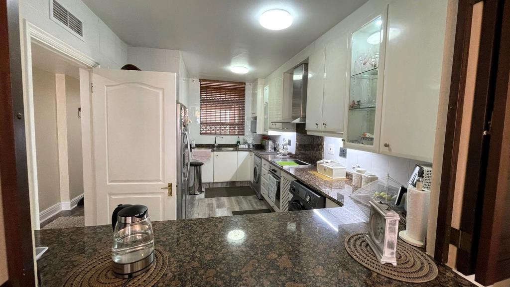Adjacent to the lounge and dining area, is a fully fitted kitchen, boasting an abundance of built-in cupboards and modern appliances, such as a stove, and conveniently plumbed for a washing machine, tumble dryer, and dishwasher.