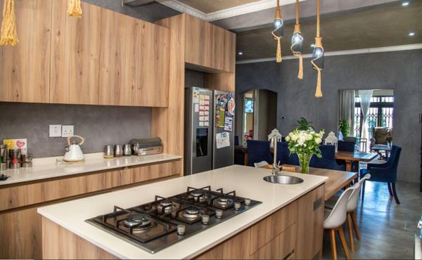 The spacious kitchen, complete with Caesar stone countertops, a gas hob, an under-counter oven, and connections for both a dishwasher and washing machine, is designed for families who love to cook and dine together. There''s ample space for a double-door fridge and much more. The kitchen flows seamlessly into the dining area and lounge, which offer direct access to the outdoor pool and entertainment area.