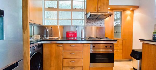The kitchen has a hob and under counter oven, extractor fan, granite counter tops, will fit a single door fridge, including place for your washing machine. There are sufficient cupboards which allows for easy storage.